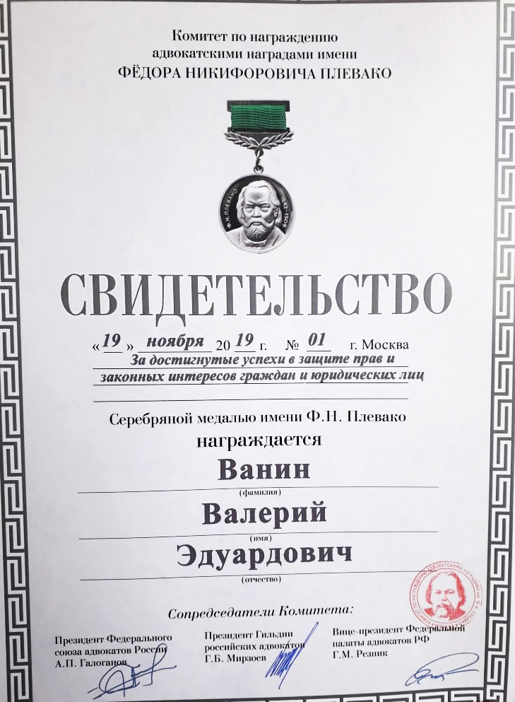 Эксперт КС НКО Валерий Ванин награжден серебряной медалью имени Ф.Н. Плевако за достигнутые успехи в защите прав и законных интересов граждан и юридических лиц, развитие юридической науки, активную правозащитную деятельность. Церемония вручения состоялась 27 августа в Федеральной палате адвокатов РФ.