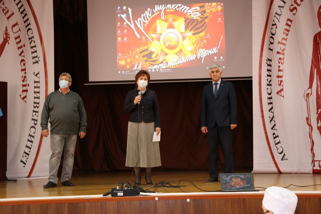 С приветствиями и пожеланиями к участникам мероприятий выступили: ректор Астраханского государственного медицинского университета, заслуженный врач РФ, доктор медицинских наук, профессор Ольга Башкина; проректор по учебно-воспитательной работе АГМУ, доктор медицинских наук, профессор Евгений Попов; руководитель региональных отделений «Поисковое движение России» и «Бессмертный полк России», председатель Астраханской областной общественной организации по патриотическому, правовому и физическому развитию молодежи и Общественной палаты Астрахани.
